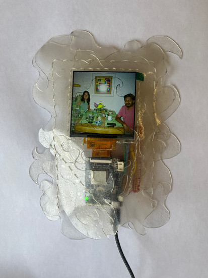 PRIYANKA: I set out to build a sort of “personal device.” Essentially, it’s a video sculpture with a screen, and it’s encased in a biodegradable plastic–a material I made myself. It really is kind of a doomsday, semi-futuristic version of a phone. I’ve drawn out different animations and video clips of texts coming through, new job posting alerts, AI videos of cats and stuff to play on the screen to mimic a phone.